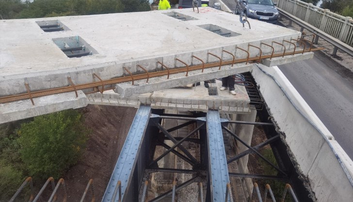През следващата седмица графикът на дейностите предвижда продължаване на изработката и монтажа на нови стоманобетонни панели, както и поставянето на болтови дюбели за връзка между панелите и стоманените главни греди.