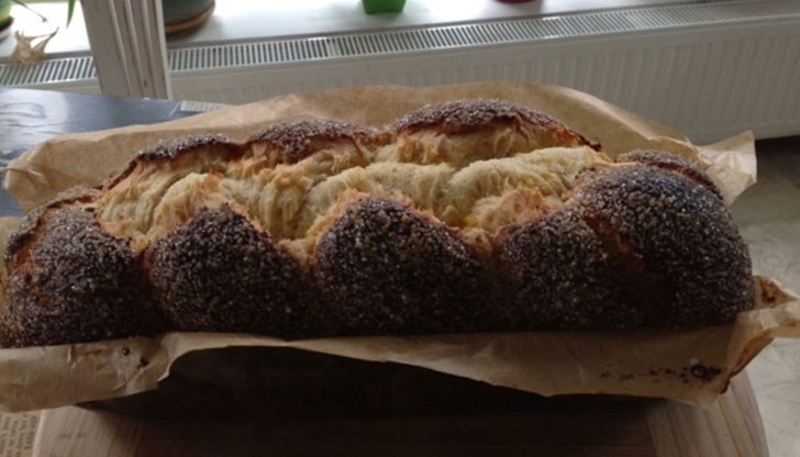 След това оформяте по желание, поставяте във форма и оставяте да втасва още 1 час. Печете на 180 градуса около 45 минути.