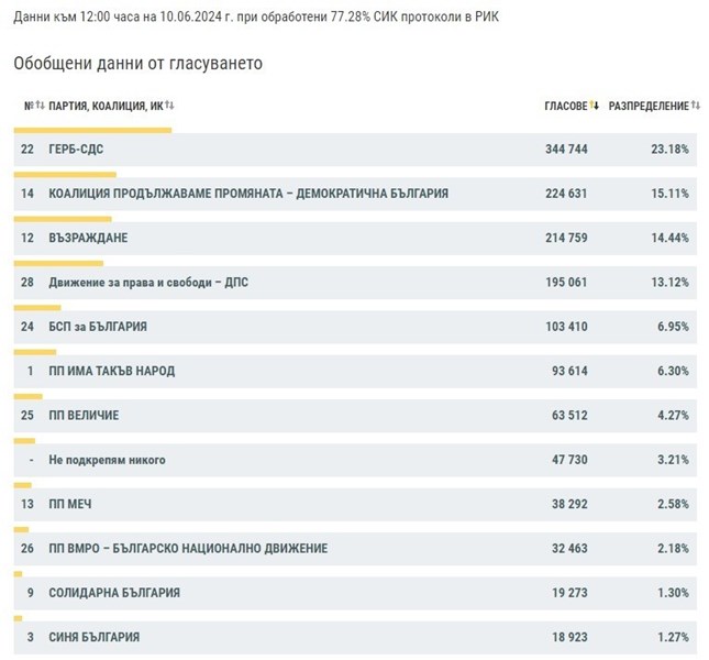 ГЕРБ-СДС е първа политическа сила с 23,18% и на проведените избори за евродепутати при обработени 77,28% от СИК протоколите.