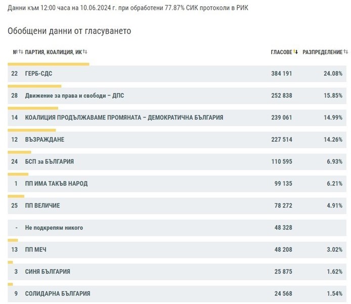 Седем политически партии и коалиции ще влязат в 50-ото Народно събрание, показват междинни данни на Централната избирателна комисия при обработени 77,87% от секционните избирателни протоколи.