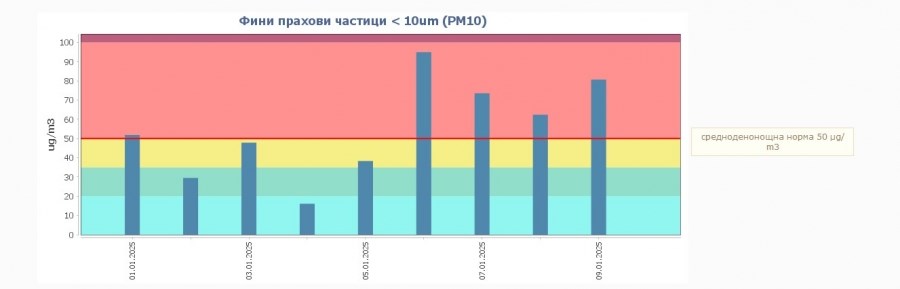 През първата десетдневка на януари са отчетени пет дни с наднормени стойности на фини прахови частици с размер 10 микрона. Превишенията варират между 1.2 и 1.8 пъти над допустимата норма от 50 микрограма на кубичен метър.