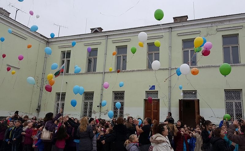 По случай юбилея, децата пуснаха 150 балона в небето в двора на школото.