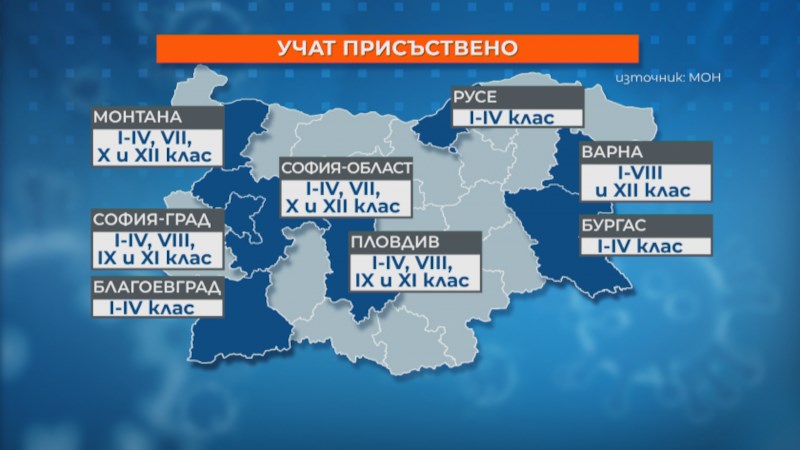 В почти всички области в страната решенията на щабовете са единодушни гимназистите да се обучават от разстояние. В някои градове са преценили, че това трябва да се случи на ротационен принцип, в други на децата, които им предстоят изпити да се върнат в класните стаи. В областите Разград, Силистра, Търговище и Шумен всички деца ще се обучават присъствено. В Бургас само учениците от 1-ви до 4-ти клас се връщат в класните стаи.