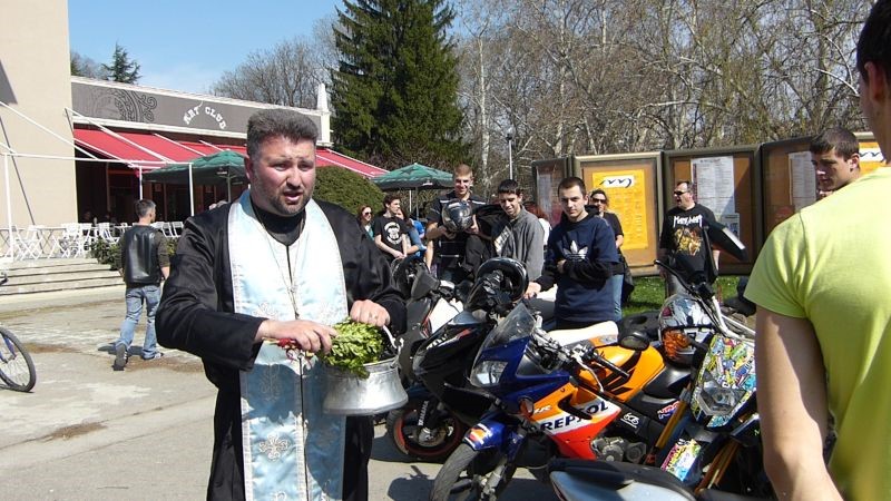 Преди да яхнат мощните си машини рокерът в расо – отец Георги, отслужи молебен за безавариен и без жертви сезон, и поръси „За здраве и дълъг живот“ със светена вода любителите на двуколесните возила и техните машини.