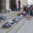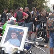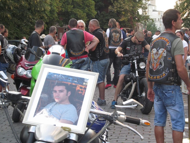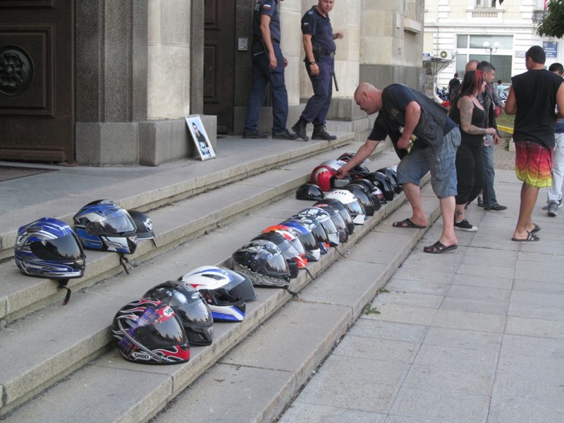 След като се събраха с моторите си на паркинга до Съдебната палата, протестиращите излязоха на площада и наредиха каските, както и портрети на загиналия си мото брат Ивайло си точно пред сграда на Темида в Русе.