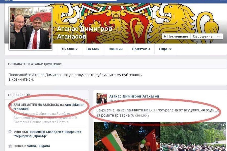 Във Фейсбук страницата си, където на профилната си снимка грее прегърнат с лидера на социалистите Сергей Станишев, варненецът от ромски произход Атанас Димитров Атанасов се представя като "zam oblasten na asuciaciq na zam oblasten predsedatel" или преведено на кирилица "заместник областен на асоциация на заместник областен председател".