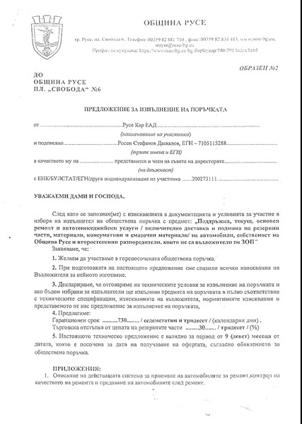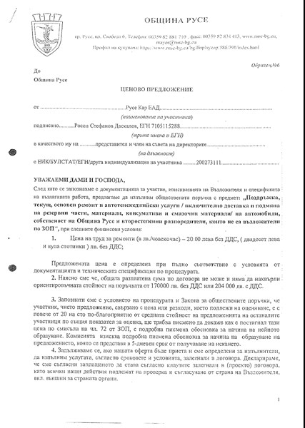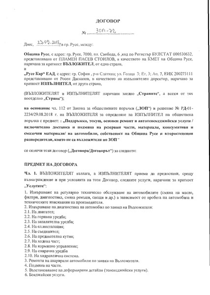 Българският Илон Мъск (както стана известен в медиите през последните дни) има договор за поддръжка и ремонт на автомобилите на Община Русе на обща стойност от 204 000 лева с ДДС. Договорът е сключен на 27.09.2018 година между Пламен Стоилов, в качеството си на кмет на Община Русе и "Русе Кар" ЕАД, представлявано от Росен Даскалов.