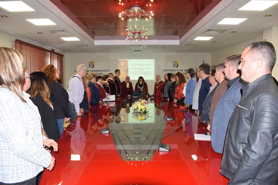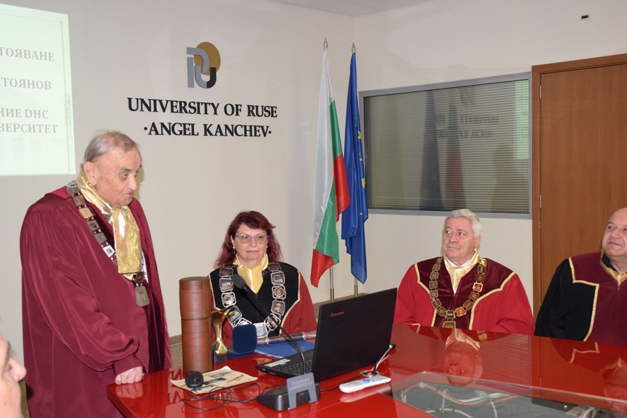 Преди церемонията академик Сгурев проведе разговор с ректора и почетния ректор за актуални теми, сред които ролята на изкуствения интелект в образованието и научните изследвания, като бе подчертана активната позиция на Русенския университет като един от десетте изследователски университета в България.