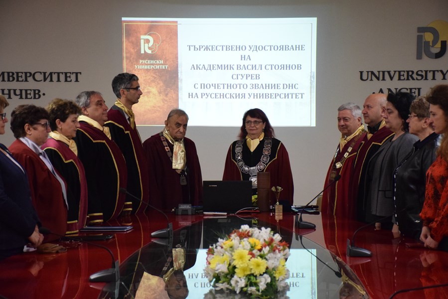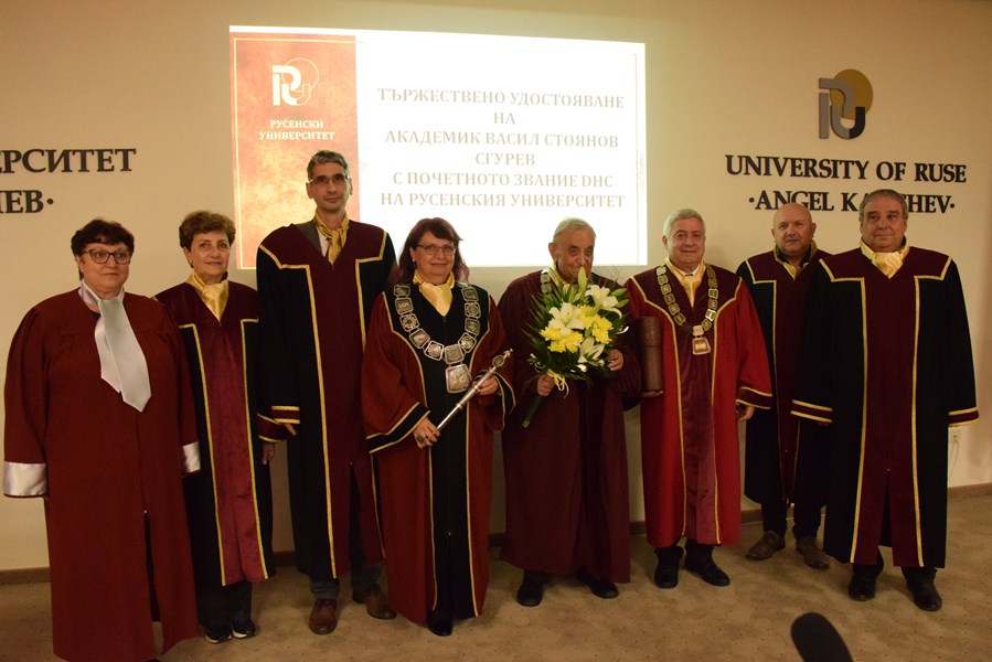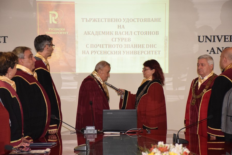 В Заседателната зала на Канев център се проведе тържествена церемония по удостояване с почетното звание "Доктор хонорис кауза" на академик Васил Стоянов Сгурев. Церемонията се състоя днес, 27 май 2025 г., след решение на Академичния съвет на Русенския университет от 22 април.
