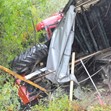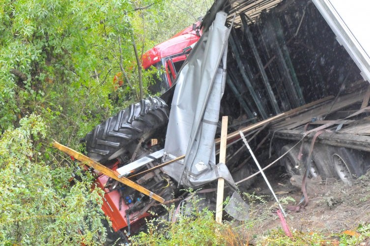ТИР-ът превозвал в ремарке трактор, който при инцидента се е стоварил до влекача. Няма данни за състоянието на водача на камиона.
