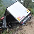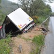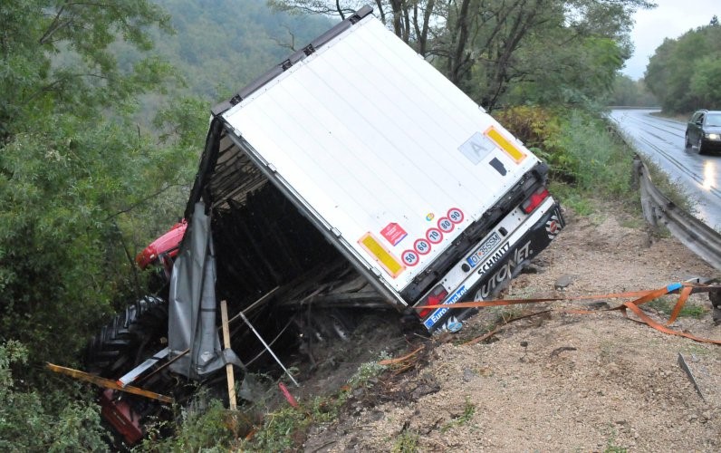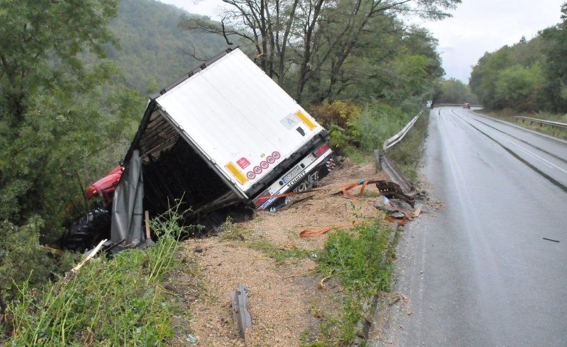 Тежкотоварният камион поднесъл на мокрия път при спускане преди селото, преминал през насрещното платно и паднал в дерето отляво по посока на движението.