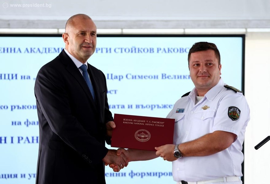 На церемонията президентът връчи дипломите на отличилите се офицери от специалността „Стратегическо ръководство на отбраната и въоръжените сили“ и „Организация и управление на военни формирования на оперативно ниво“. Отличниците на випуска, капитан I ранг Калушко Ганев и капитан III ранг Иван Алексиев, получиха дипломите си лично от Румен Радев.