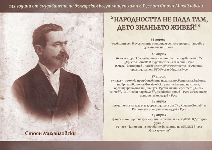 132 години от написването на проекта за български всеучилищен химн ще се отбележи в Русе идната седмица. Една от гордостите на града е написването му на 15 април 1892 г. от учителя по френски в тогавашната Мъжка гимназия, днес СУ „Христо Ботев“, Стоян Михайловски.