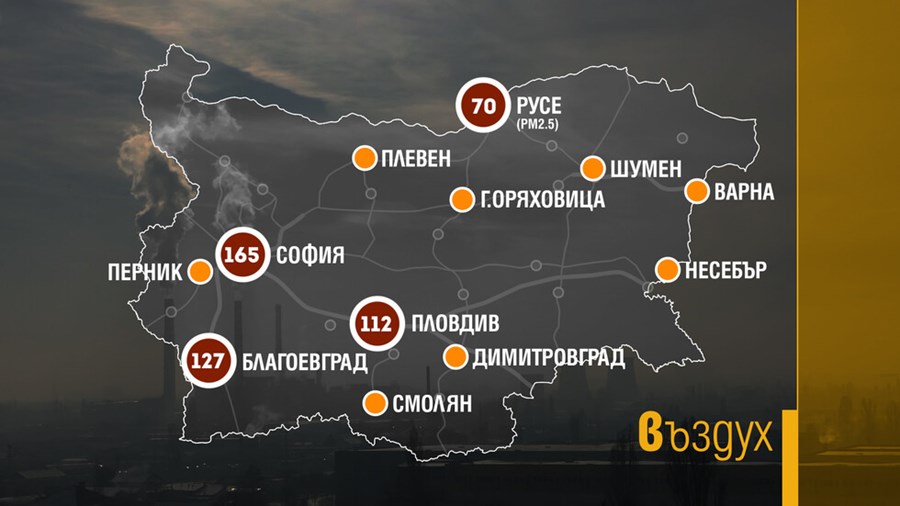 В София стойностите са средно три пъти над допустимото. Такова е замърсяването и в Благоевград, а в Пловдив - два пъти над допустимите среднодневни концентрации.