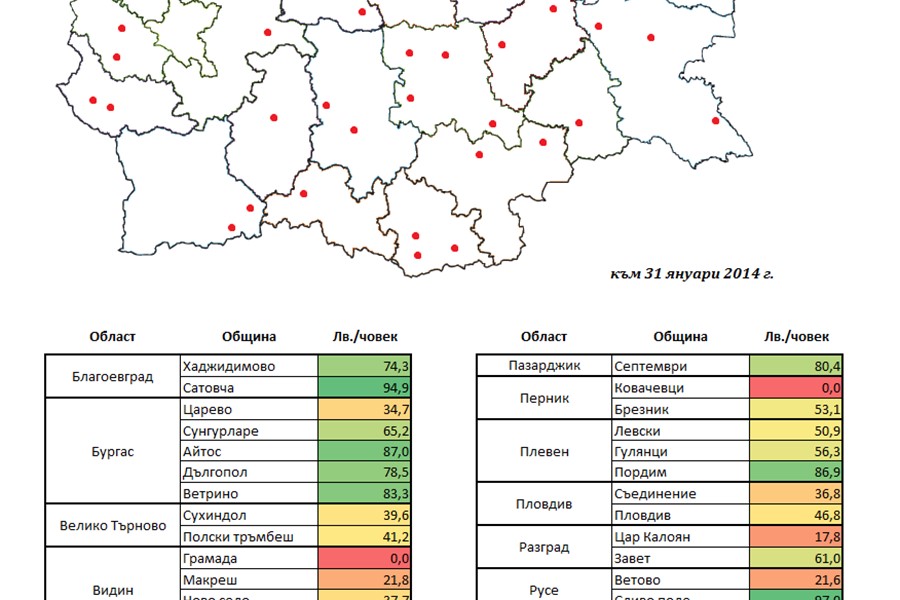 В 26 общини са усвоени над 1000 лв. на човек от населението. Сред тях са Габрово и Добрич-град, които са единствените два областни центъра в тази група. Прави впечатление присъствието на община Бяла (област Варна), в която живеят малко над 3 хиляди души, но която до 31 януари 2014 г. е усвоила над 7 млн. лв.