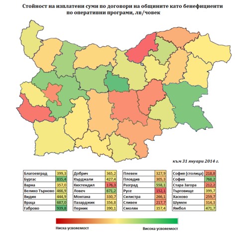 Най-много средства до началото на 2014 г. са усвоили общините в област Бургас – 285,7 млн. лв., а най-малко - тези в област Кюстендил, 23,2 млн. лв. С цел по-добрата съпоставка между скоростта на усвояване на европейски средства, на приложената карта е показано усвояването на европейски средства на глава от населението. Най-висока усвояемост се наблюдава в областите Габрово, Бургас и София (област), а най-ниска в областите Русе, Кюстендил и Стара Загора.
