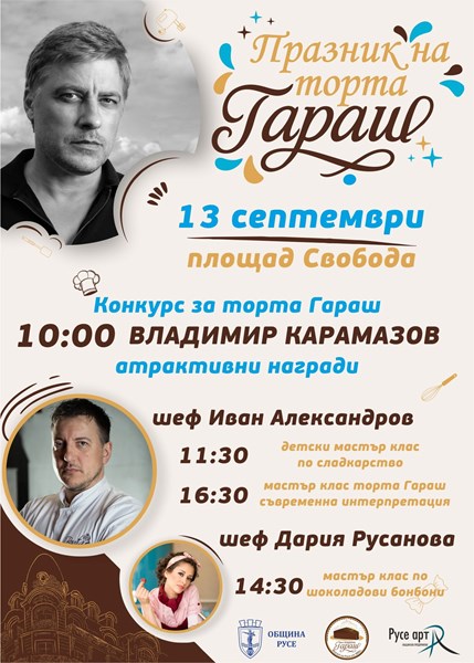 Шеф Иван Александров ще демонстрира приготвянето на миниатюрни хапки „Гараш" по своя рецепта на сцената до Съдебната палата между 16:30 и 18 часа. Русенската сладкарка Дария Русанова ще представи открит мастър клас по приготвяне на шоколадови бонбони в 14:30 часа.