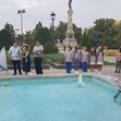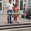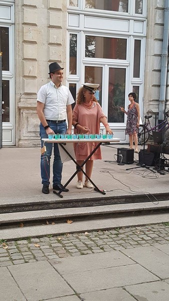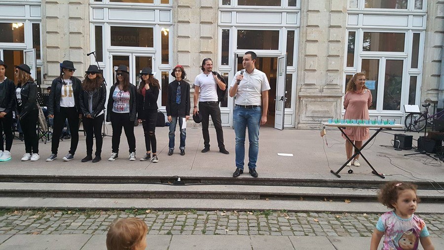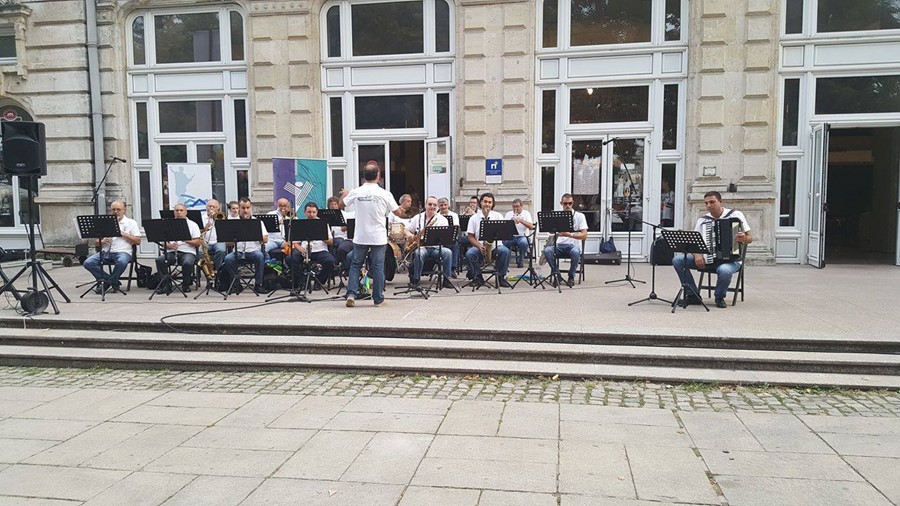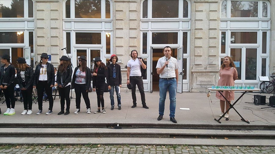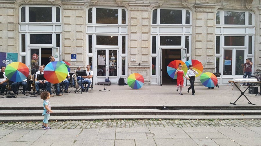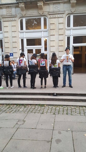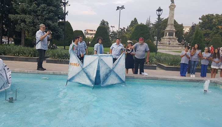 В уникалната артистична акция с наименование „По вода“ се включиха около 60 ученици и 12 преподаватели от НУИ „Проф. Веселин Стоянов“, педагози от центъра за неформално образование и културна дейност „Алос“ и музикантите от Биг бенд Русе.