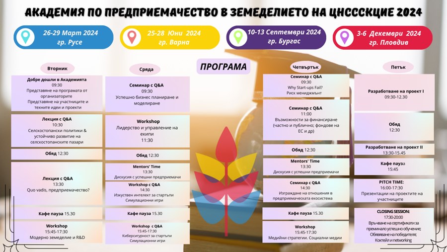 В рамките на 4 дни млади предприемачи и стартъпи от сектор Селско стопанство ще имат възможност да участват в безплатни лекции и семинари и да разработят свой бизнес план. Сесията ще се проведе в сградата на Русенския университет „Ангел Кънчев“. Най-иновативни проекти от всяко издание ще получат финансова награда до 5000 лв. Подкрепена от представители на реалния сектор, браншови и неправителствени организации, университети, стартъпи и успешни предприемачи, академията цели да насърчи младежкото предприемачество и да провокира иновативни концепции в сферата на земеделието.