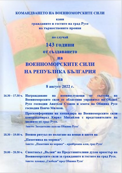 143-годишнината ще бъде отбелязана на 8 август (понеделник) със специална програма. От 16:30 ч. в Заседателната зала на Общината кметът Пенчо Милков ще награди трима военнослужещи от състава на Военноморските сили. След това той ще даде съвместна пресконференция с командира на Военноморските сили контраадмирал Кирил Михайлов и областния управител Анатоли Станев.