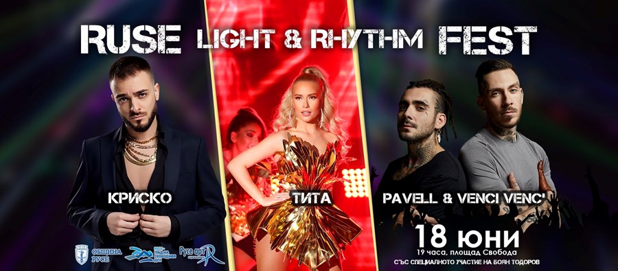 Вечерта приключва с „Ruse light & rhythm fest”, който ще се проведе на Голямата сцена на площад „Свобода“. Там в 19 ч. ще започне концертът на Павел и Венци Венц, последван от изпълнения на Тита. ПГ по облекло „Недка Иван Лазарова“ ще демонстрират „Светлината в моя гардероб – футуристично светещо модно ревю на учениците на гимназията. В 21 ч. Криско ще закрие програмата със своите песни, а в 22 ч. посетителите ще могат да се насладят на лазерно шоу.
