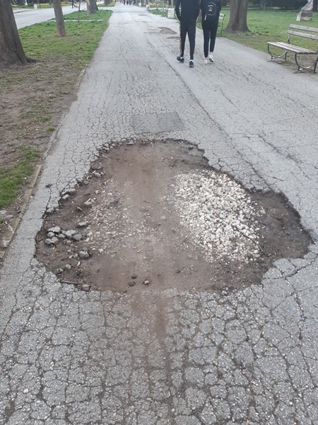"Една от многото кървящи с години рани в парка! А алеята от Кенора към Дунава е още по-голяма рана. Идва Търлата, сигурно ще заведем приятели от други населени места и ще ни е срам, че вървим по натрошен асфалт. Но ремонтът не трябва да е, защото идва време за търла, а за нашето лично самочувствие. От редките ми разходки в морските градини на Варна и Бургас не помня толкова лош участък. Ние не заслужаваме ли хубави алеи в парка?"