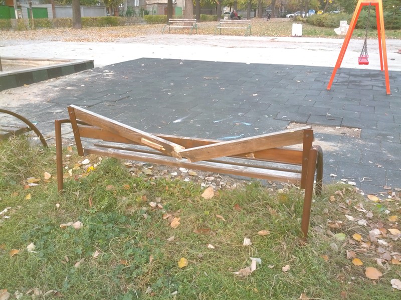 Кадрите показват строшена пейка, върху която вероятно "баби с бицепс 44 см са върлували за загрявка", както и изтръгната "бивша табела" с описание на построеното на площада, фонда и стойността на проекта...