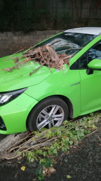 Младежът е бил на работа с личната си кола, когато кол от сухо дърво се е забил от страна на шофьорското място. "Разминал се е на косъм с най-лошото. За щастие не наранен, но е в шок", споделя майката в публикация във Фейсбук.