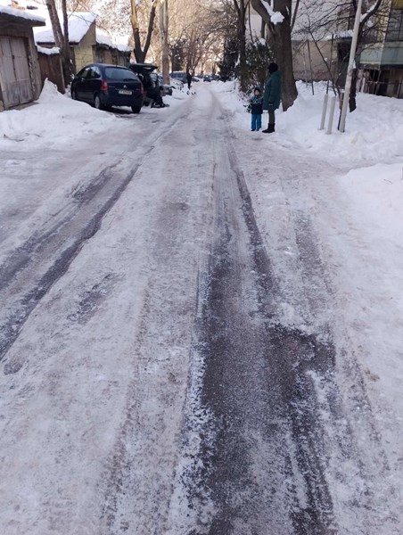 Кадрите показват, че районът не е обработен с препарати против заледяване, въпреки зимните метеорологични условия през последните дни.