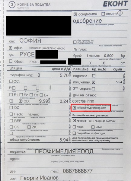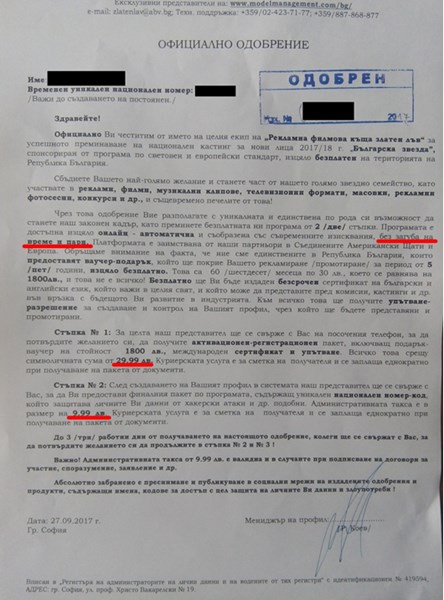 Казват й че ще изпратят документи и трябва да заплати 9,99 лв за някаква такса, която е описана в документите. Гери получава документите, заплаща таксата, но нещо се усъмнява. Започва да търси информация за конкурса и фирмата, но нищо не намира. Фирмата отново е „Профимедия“ ЕООД. Продължава да търси и намира статията в интернет, която ОЗБГ беше написала и изпратила до медиите, и се свързва с нас. Разказа за случая и изпраща снимки.