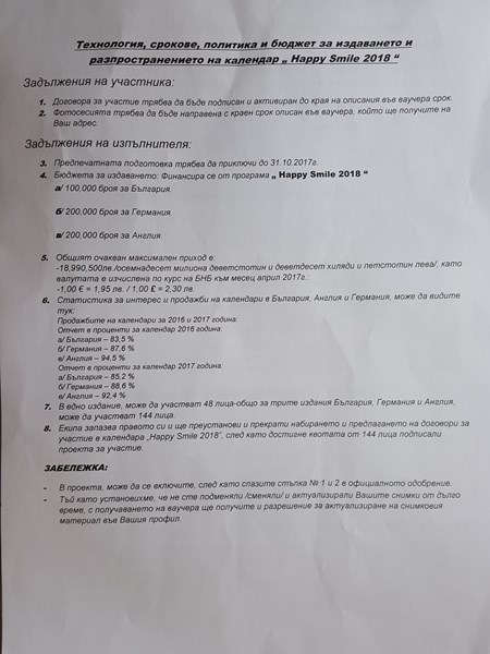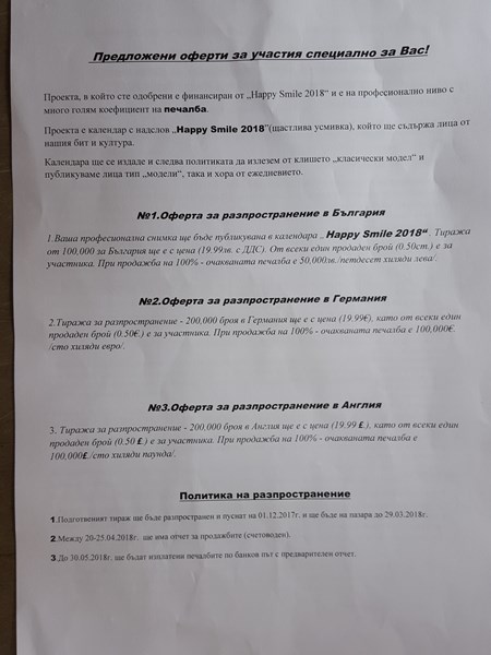 „И на мен ми се обадиха вчера и се оказва същата работа уж по европейски проект , календар хепи фейсес за 2018г ,няма да си взимам документите , смятам че е измама. Жената която ми се обади , е от фирма , която подготвя документи, но каза , да не ги взимам ако имам съмнения , поредната глупава измама , и то на дребни пари, но умножено кой знае , колко изкарват.“