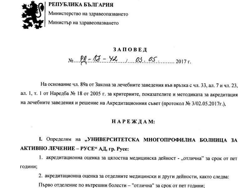 УМБАЛ - Русе получи отлична акредитационна оценка за цялостна медицинска дейност за срок от пет години.