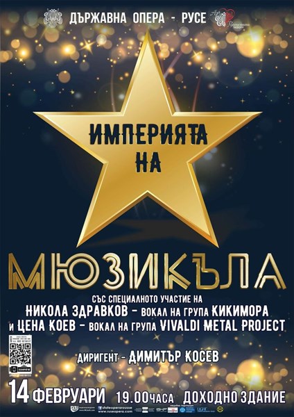 В Деня на любовта и виното Русенската опера ще зарадва публиката си с концерта "Империята на мюзикъла". Той ще се състои тази вечер в Доходното здание в крайдунавския град, съобщи пиарът на културния институт Диана Димитрова, предаде БТА.
