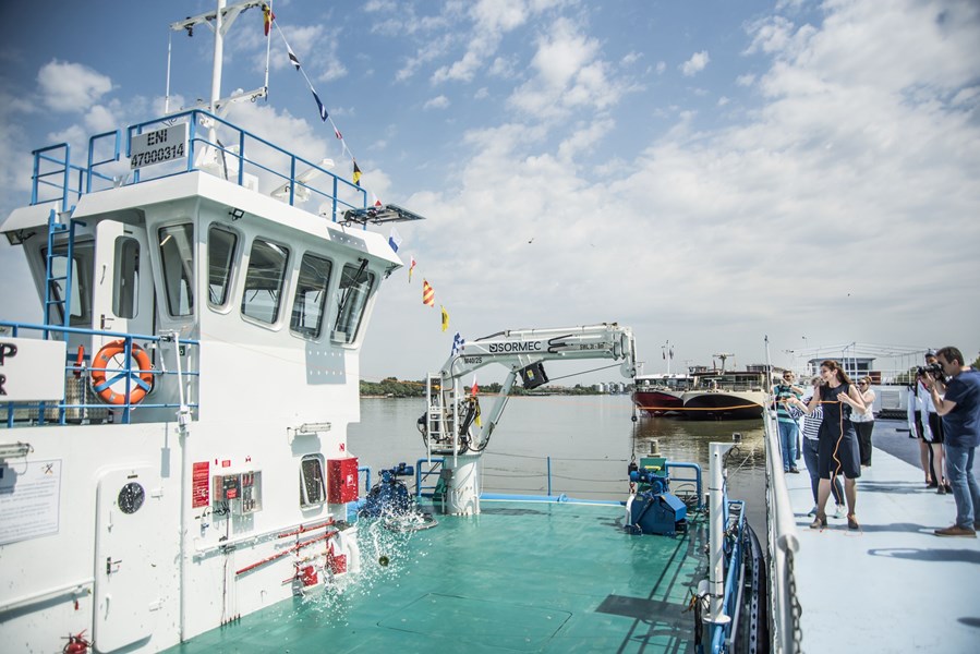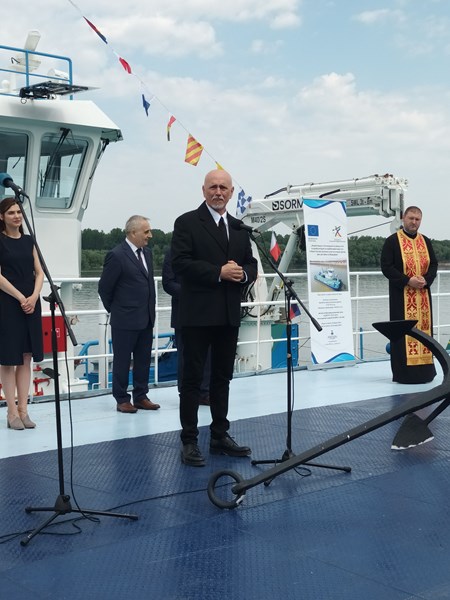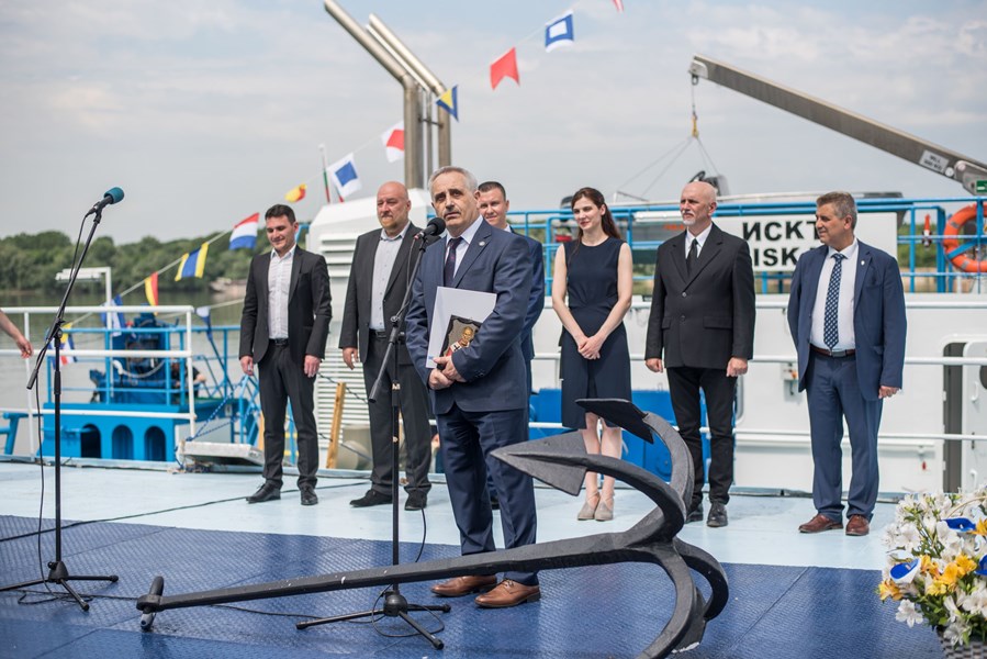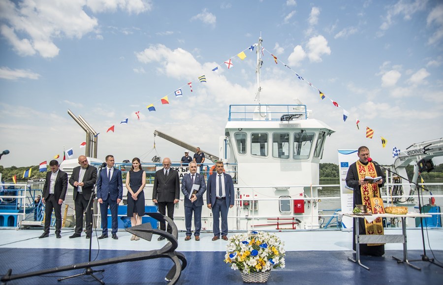 Най-новият кораб от флота на Изпълнителна агенция „Проучване и поддържане на река Дунав“ получи официално своето име.