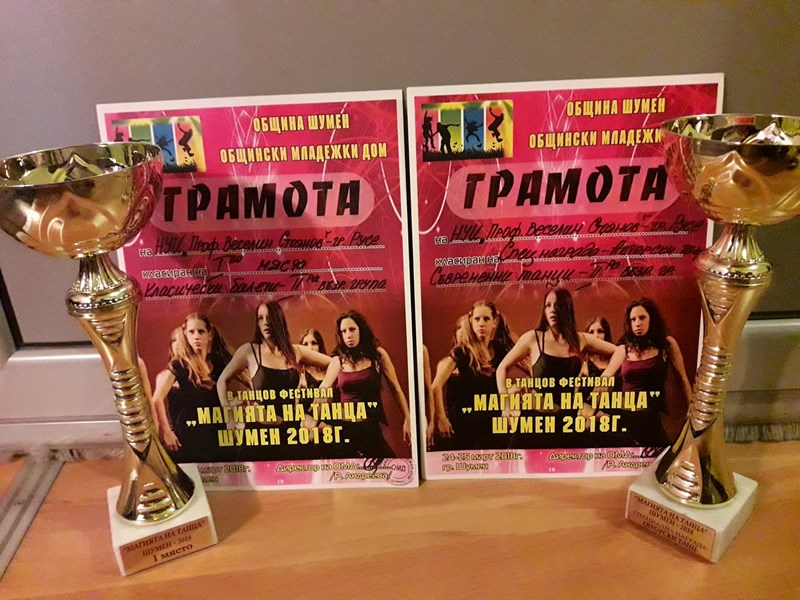 Няколко купи и призови места завоюваха балерините от Националното училище по изкуствата „Проф. Веселин Стоянов“ – Русе на XIII-ия Национален фестивал „Магията на танца“, който се проведе в Шумен през изминалия уикенд (24 – 25 март 2018 г.).