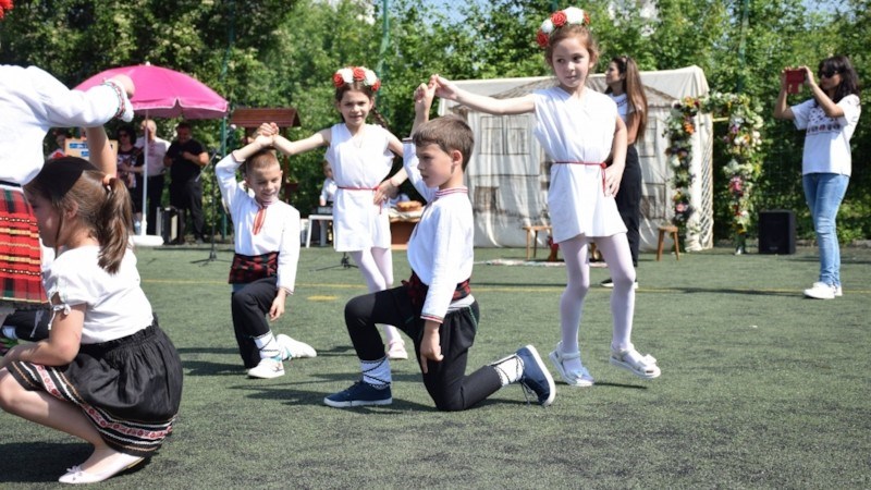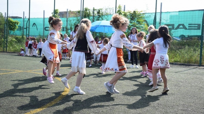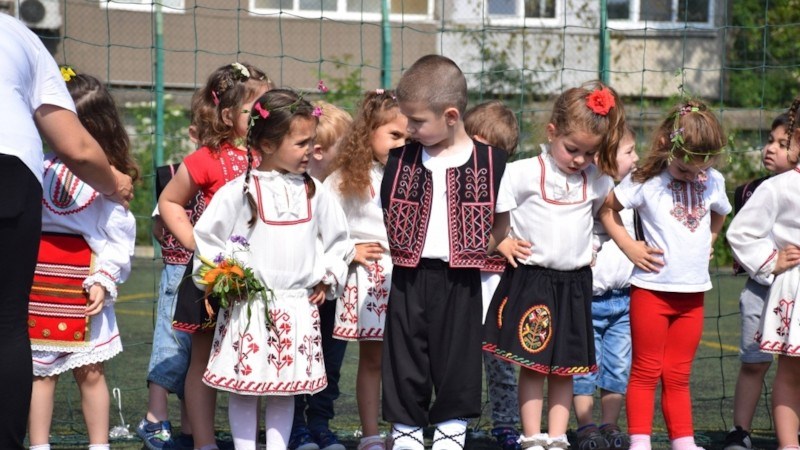 На спортното игрище на басейн „Олимпия“ в ж.к. „Дружба“ малчуганите демонстрираха знания за българските традиции и обреди, облечени в народни носии.