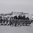 Преглед на строевата подготовка и маршовата песен на ученици от училище „Олимпи Панов“, град Русе, България, 1965 г. На снимката се вижда сборен отбор от ученици в униформи във военен стил, които в продължение на месец се обучават от военен специалист (в ляво на снимката) да маршируват и да пеят войнишки песни. Военното обучение – за защита на родината и социалистическите страни, изгражда силно идеологическо присъствие в училищата. Прегледът – състезание се случва на централния градски площад в Русе, в него участват всички училища в града. Маршрутът на участниците повтаря този на официалните задължителни „манифестации“ – митинги-шествия на работниците по повод национални празници. Вляво се вижда обичайна транспарант с пропагандна украса – гълъб на мира върху земно кълбо.