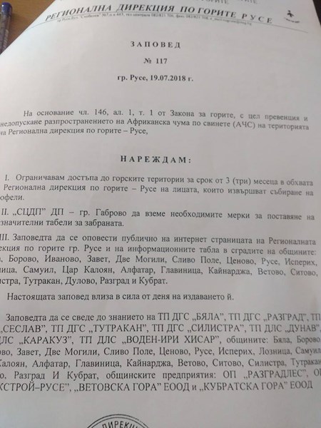 Забраната е с цел превенция и недопускане на разпространението на Африканска чума по свинете на територията на "Регионалната дирекция по горите" - Русе.