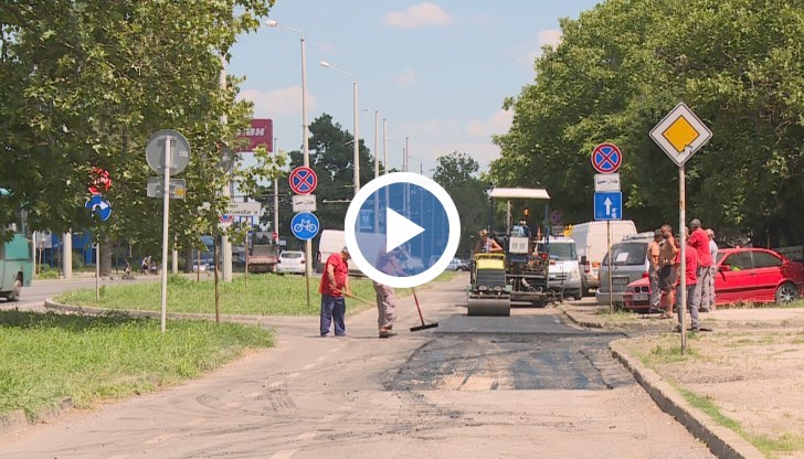 В един от кварталите на Русе в жегата общински работници запълват дупките по улиците.