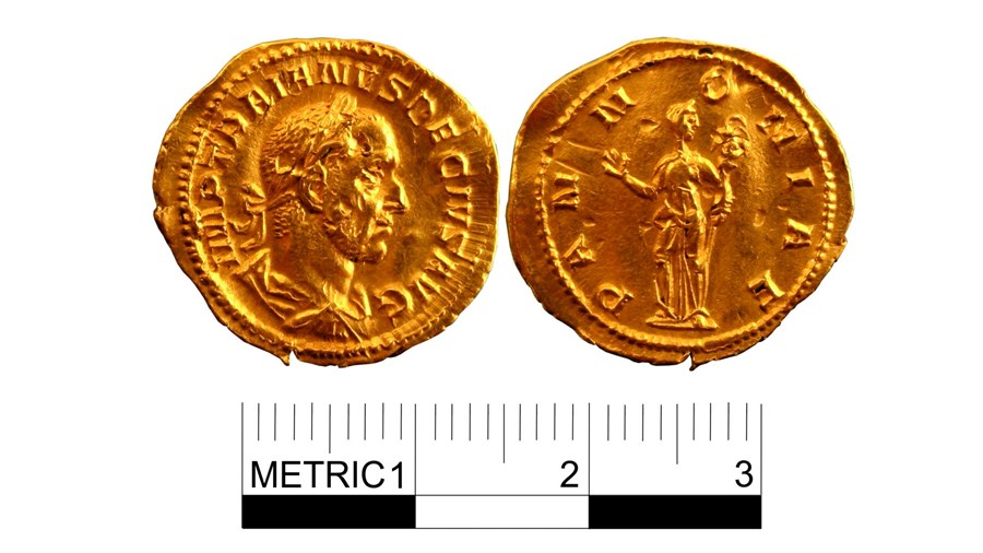 Златната римска монета тежи 4,32 грама и на едната ѝ страна е изобразен император Траян Деций, а на другата - женска фигура, която е персонификация на провинция Панония.