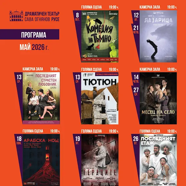 Майският афиш започва на 8 май от 19:00 часа на Голяма сцена с постановката "Комедия на тъмно" от Питър Шафър, режисирана от Ивайло Ненов. На 12 и 21 май в Камерна зала ще се играе "Лазарица" от Йордан Радичков с участието на Милен Димитров.