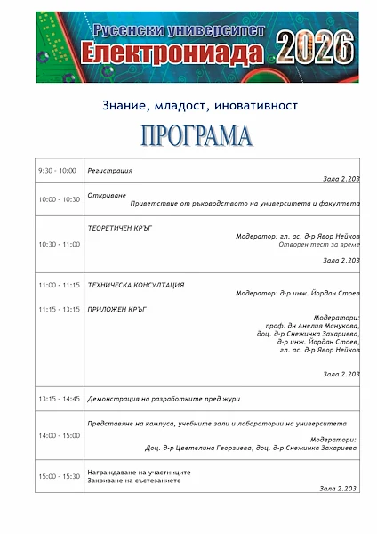 Факултет „Електротехника, електроника и автоматика" към Русенския университет „Ангел Кънчев" ще бъде домакин на седмото поредно издание на Националното младежко състезание „Електрониада". Технологичната надпревара ще стартира официално на 7 март 2026 година от 10:00 часа в зала 2.203 на висшето училище.
