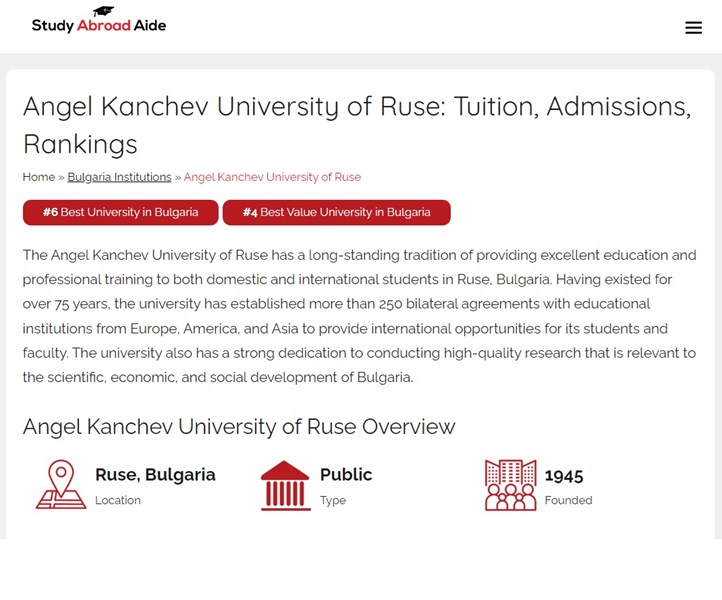 Русенският университет „Ангел Кънчев" заема престижното шесто място сред българските висши училища в световна класация, базирана на последните данни от университетската база данни в Study Abroad Aide за 2024 година. Тази класация обхваща 8 023 университета от 69 държави и е считана за най-изчерпателната в света. За Русенския университет това е потвърждение на високото качество на образованието, което предлага, и неговата привлекателност за международни студенти. В световната класация включените български университети са 47.