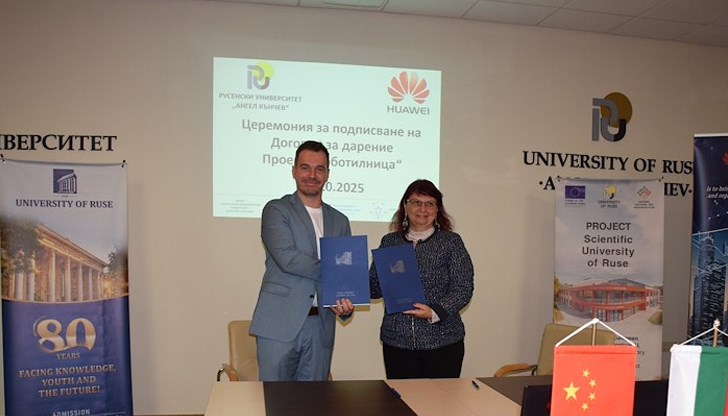 Русенският университет "Ангел Кънчев" и "Хуауей Технолоджис България" подписаха меморандум за сътрудничество по проект "Роботилница" на официална церемония днес. Ректорът на университета доц. д-р Десислава Атанасова и мениджър "Ключови клиенти" Руслан Цанков поставиха подписите си в зала 1 на Канев център.