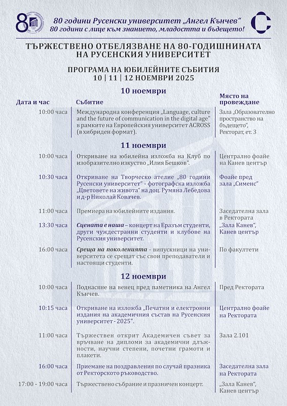 Русенският университет „Ангел Кънчев“ ще отбележи своята 80-годишнина с поредица от празнични събития, които ще се проведат в периода от 10 до 12 ноември 2025 година. Програмата включва научни конференции, художествени изложби, концертни изпълнения и тържествени церемонии, които ще обединят студенти, преподаватели, гости и възпитаници на университета.