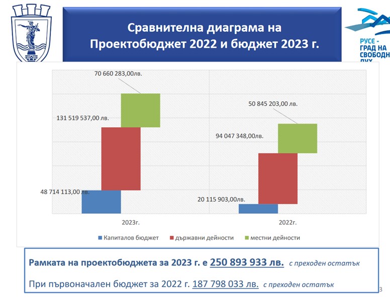 Предвид извършените промени в общинските наредби в началото на мандата и добрата събираемост на собствените приходи миналата година, през 2023 г. е възможно изпълнението на мащабни ремонти на междублоковите пространства, тротоари, паркове, осветление и други елементи от градската среда; увеличаване на средствата за ремонти на уличната мрежа в малките населени места, подобряване на енергийната ефективност на общинските сгради, подкрепа за русенската култура и спорт, въвеждане на уеб платформа и мобилна версия за сигнали на граждани и развитие на Общинска полиция.