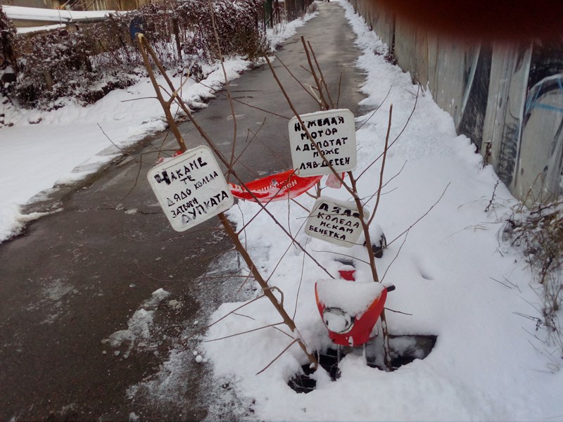 Граждани са опитали да обезопасят голяма дупка, като са сложили и табели с надписи "Чакаме те, Дядо Коледа, затвори дупката", "Не желая мотор и депОтат, може ляв десен" и "Дядо Коледа, искам вЕнетка".