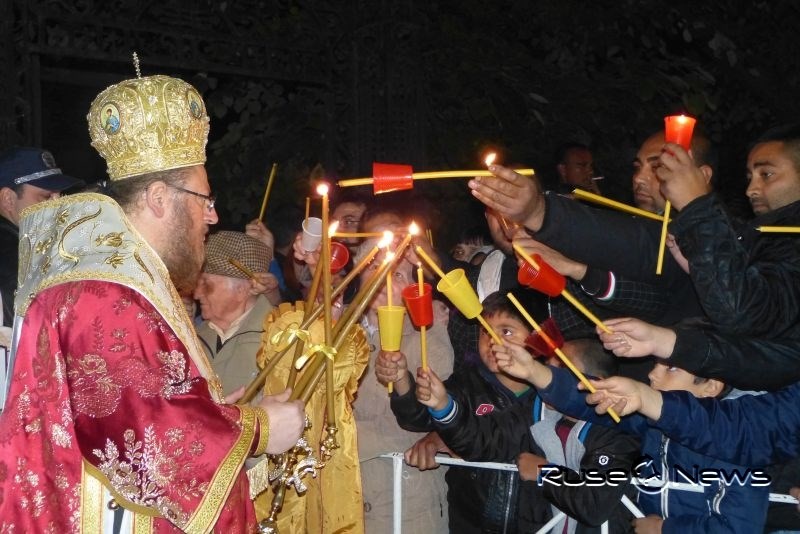 Много русенци се събраха при Катедралния храм „Света Троица” за посрещането на Възкресение Христово и да чуят посланието на НВПр Русенския митрополит Наум.