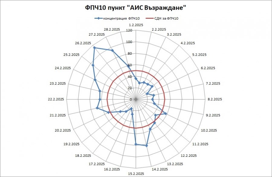 Най-тревожните данни са регистрирани на 26 февруари, когато измерената стойност е била 2,3 пъти над допустимата норма от 50 микрограма на кубичен метър. Най-ниската стойност на измереното превишение е отчетена на 20 февруари - 1,05 пъти над нормата.