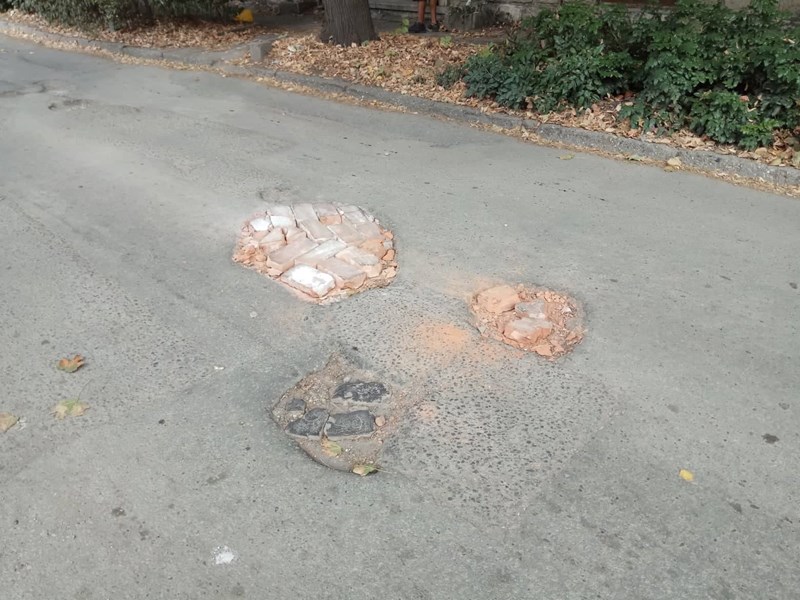 Хората "зидат" зейналите дупки, защото явно на общината не може да се разчита. Не е ясно по какви критерии се определят улиците, които попаднаха в списъка за ремонти. Тази даже не е предвидена и за "кърпене".